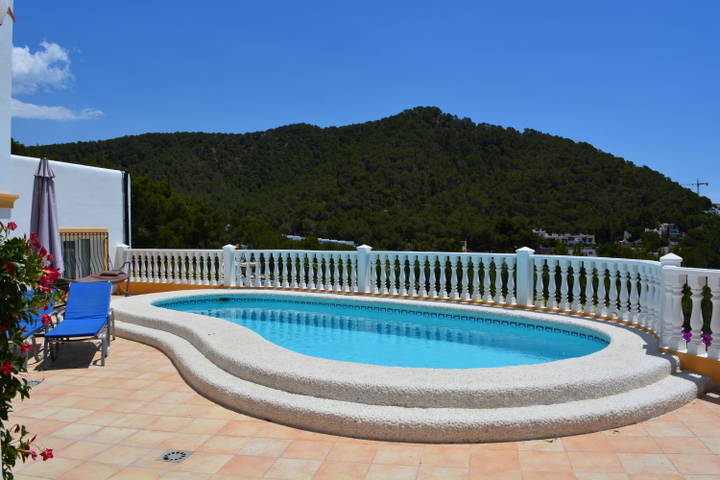 The wide sandy beach is situated in a beautiful bay with a gently sloping sea, making it ideal for children. A nice chiringuito is on the beach for the necessary snacks and drinks. A little further away it can also be more luxurious in the hidden bay of Sol d'en Serra with the Beach Club Amante. The town of Santa Eularia (4 km) offers a lot of fun with a nice boulevard and many restaurants. A little further but still close to Ibiza town (12 km). Nice streets and cozy squares with terraces, boutiques, bars, restaurants and also a bit of culture in 'Dalt Villa'; the old city. Ibiza city can also be reached with a nice boat trip from Cala Llonga. For active people there is a tennis court at 800 m and a golf course at 3 km (Roca Llisa, 9 and 18 holes). Another fun outing is the hippy market Es Canar at 10 km. A supermarket and bank can be found in Cala Llonga.